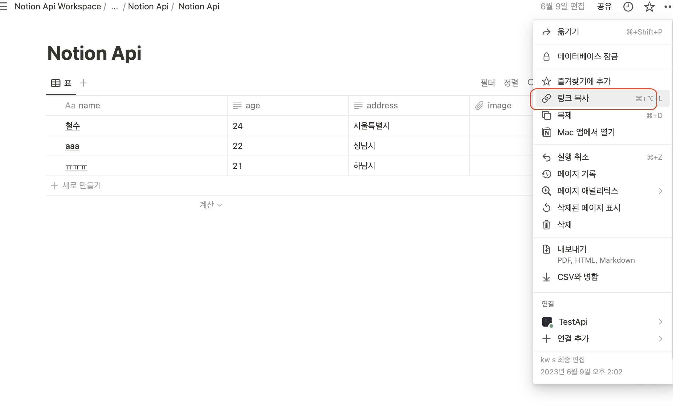 우리는 아이폰에서 저 'TestApi'를 통해 제 노션에있는 데이터베이스 테이블에 접근할 수 있어요.
